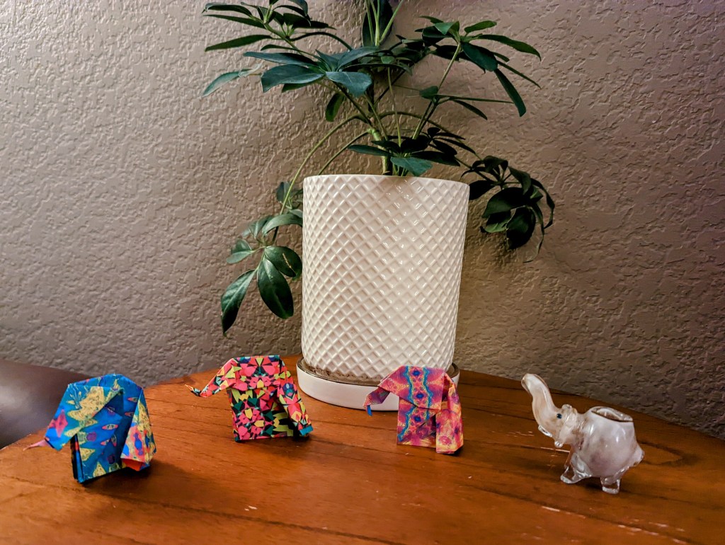 Success: We celebrated Ganesh Chaturthi this week, which meant delicious food and origami! I wanted to make Ganeshas out of play dough but didn’t pick it up in time, so we opted for origami. I was actually super impressed that we successfully made elephants. 🙂