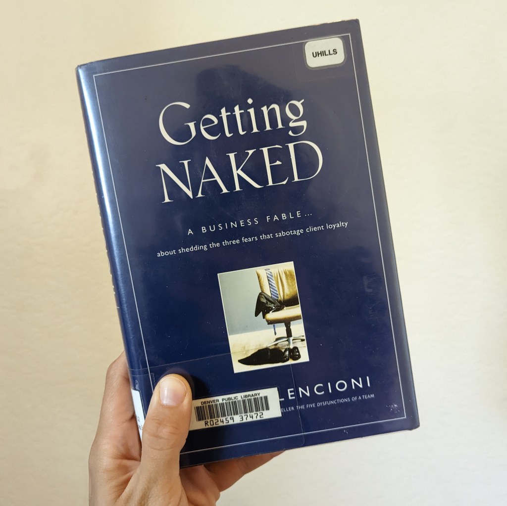 Book: Finished Getting Naked: A Business Fable about Shedding the Three Fears That Sabotage Client Loyalty by Patrick Lencioni. It was a quick read and interesting, but I wouldn’t recommend for someone who isn’t in consulting or other client-focused work.