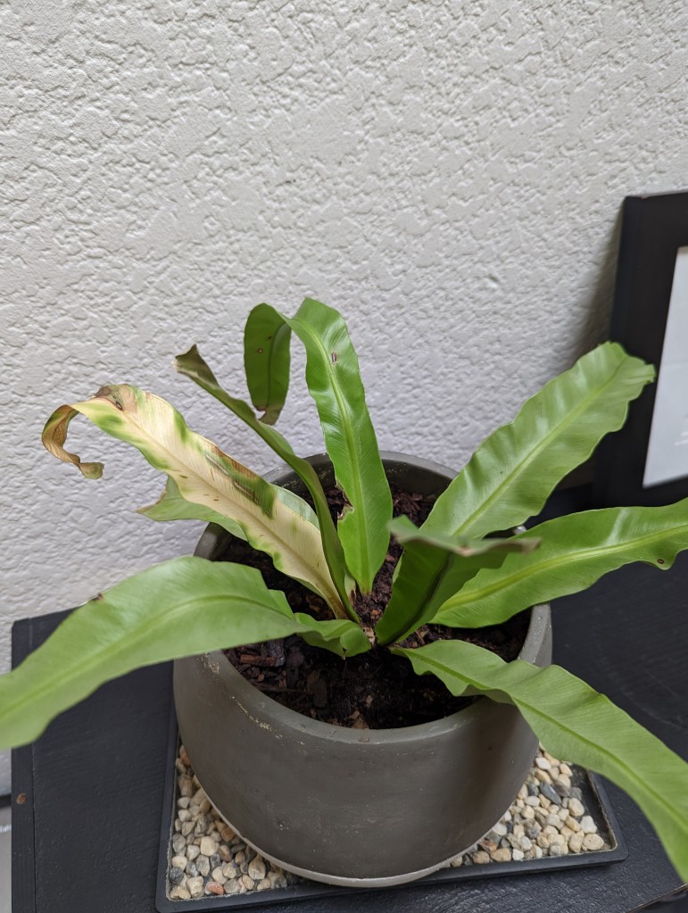 Flop: my bird’s nest fern is hanging on for dear life and I’m doing it no favors. This recent white leaf prompted a move to a lighter room, but I don’t feel particularly hopeful.